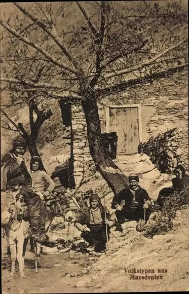 Ak Volkstypen aus Mazedonien, Bauern, Lastenesel, Steinhütte