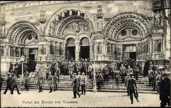 Ak Vouziers Ardennes, Soldaten am Portal der Kirche