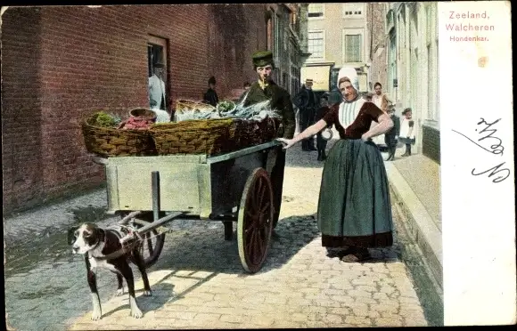 Ak Walcheren Zeeland, Hundekarren, Mann und Frau in Tracht