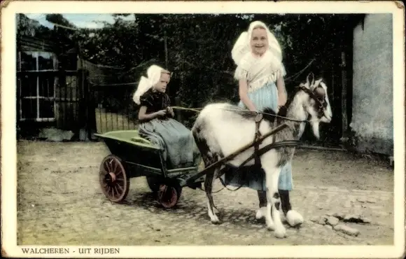 Ak Walcheren Zeeland, Mädchen in Tracht, Ziegenkarren