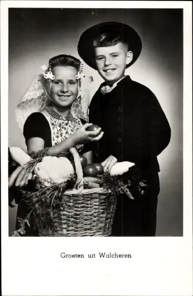 Ak Walcheren Zeeland, Mädchen und Junge in Tracht, Gemüsekorb