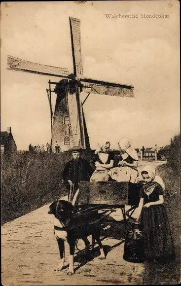 Ak Walcheren Zeeland, Windmühle, Milchkarren, Trachten, Hundekarren