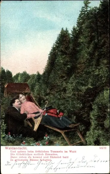 Ak Waldandacht, Liebespaar, Frau auf einem Liegestuhl