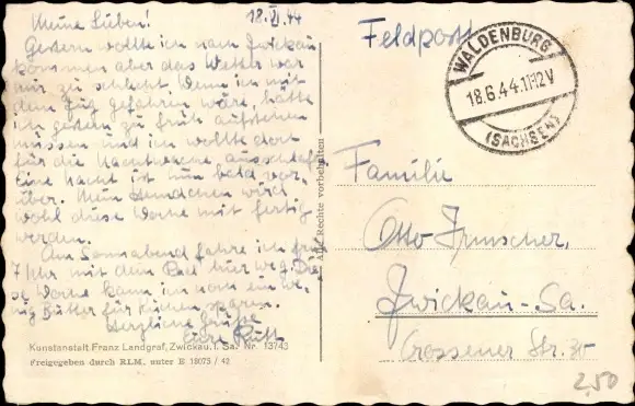 Zustand, siehe Scan, gelaufen, 1944 - ca 14 cm X 9 cm