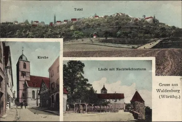 Ak Waldenburg in Württemberg, Gesamtansicht, Kirche, Linde, Nachtwächterturm