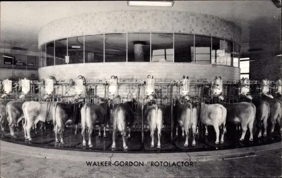 Ak Walker Gordon Rotolactor, Kühe an einer Melkmaschine