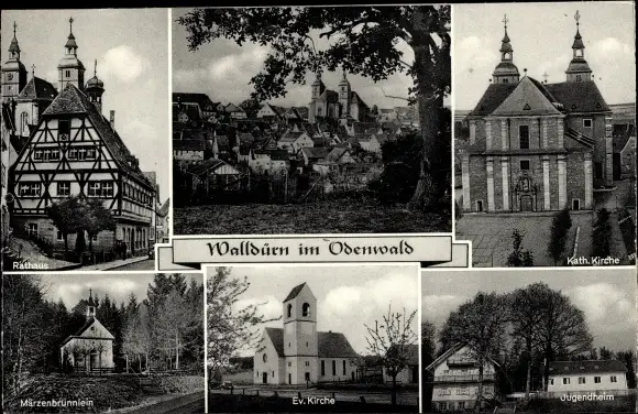 Ak Walldürn im Odenwald, Kirchen, Rathaus, Märzenbrünnlein, Jugendheim