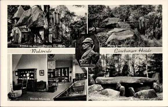 Ak Walsrode in der Lüneburger Heide, Kirche Meinerdingen, Heide-Museum, Hermann Löns Grab