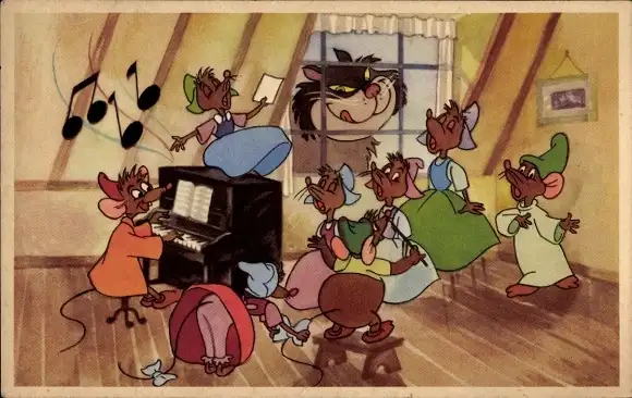 Ak Walt Disney, Comic, Musizierende Mäuse, Katze