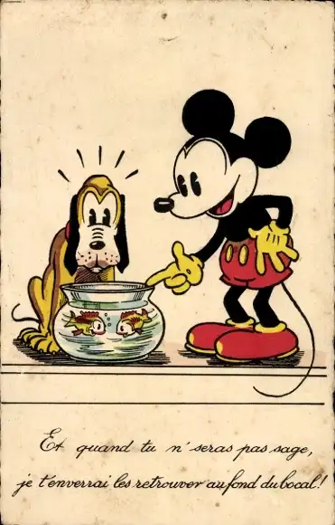 Ak Walt Disney, Mickey Mouse, Pluto, Fische im Aquarium