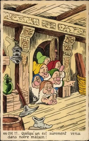 Ak Walt Disney, Schneewittchen, Zwerge, Wohnstube, Spitzhacke