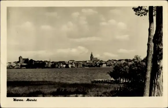 Ak Waren an der Müritz, Schwarzweißbild eines Sees, Stadtansicht mit Kirchturm, Bäume im Vorde...