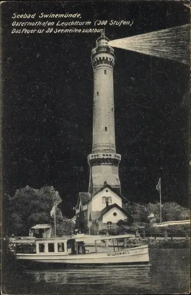 Ak Warszów Osternothafen Świnoujście Swinemünde Pommern, Leuchtturm bei Nacht