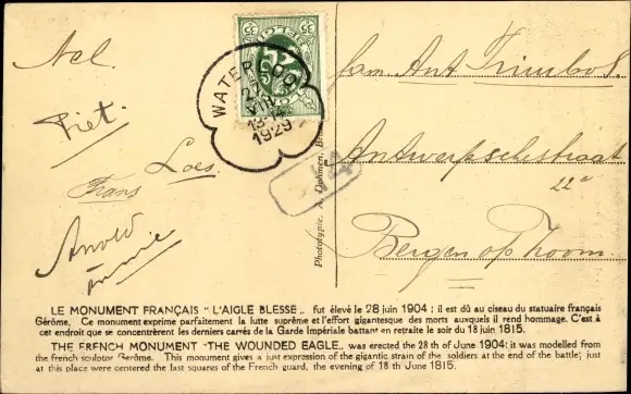 Ak Waterloo Wallonisch Brabant, Monument francais l'aigle blesse