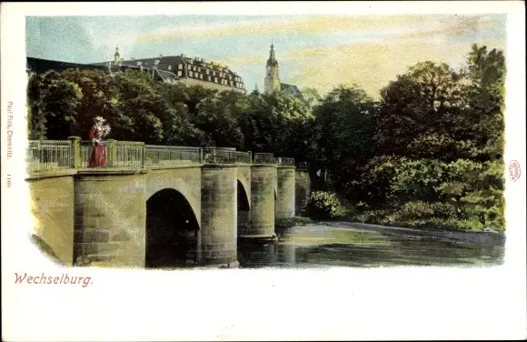 Ak Wechselburg Sachsen, Flusspartie mit Brücke, Schloss, Kirchturm