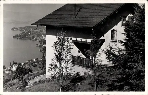 Ak Weggis Kt. Luzern Schweiz, Blick vom Sonnenbergli in Tal auf Stadt und See