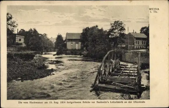Ak Weida in Thüringen, Hochwasser am 15. August 1924, Brücke, Lederfabrik