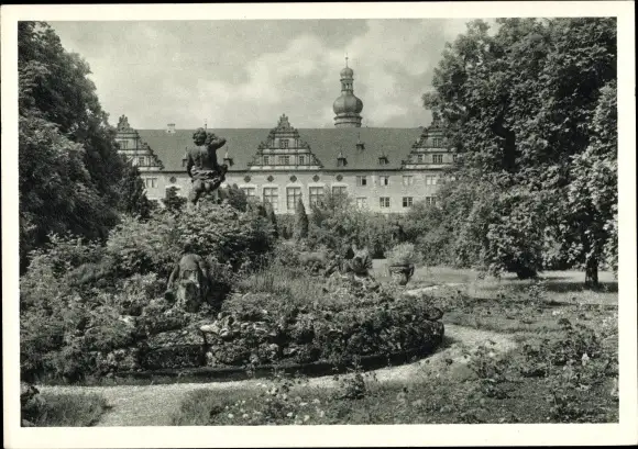 Ak Weikersheim in Tauberfranken Württemberg, Schloss, Gartenfront, Brunnen