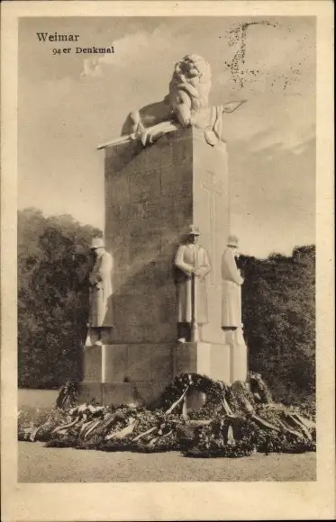 Ak Weimar Thüringen, Ansicht des 94er Denkmales, Löwe, Soldaten, Kränze