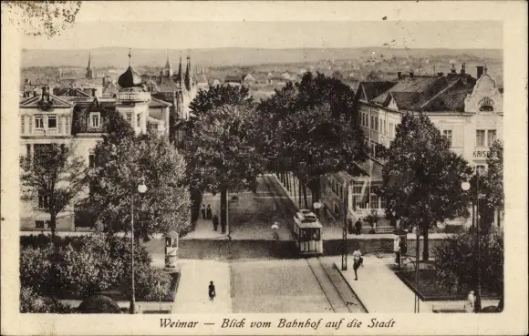 Ak Weimar in Thüringen, Blick vom Bahnhof auf die Stadt, Straßenbahn