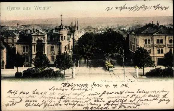 Ak Weimar in Thüringen, Panorama, Hotel Kaiserin Auguste, Straßenbahn