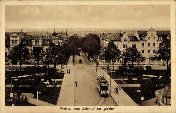 Ak Weimar in Thüringen, Straßenpartie vom Bahnhof aus gesehen, Straßenbahn