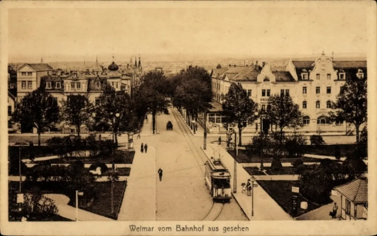 Ak Weimar in Thüringen, Straßenpartie vom Bahnhof aus gesehen, Straßenbahn