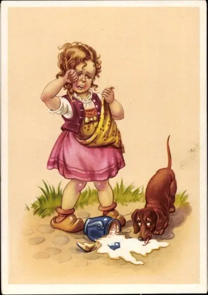 Ak Weinendes Mädchen, zerbrochener Milchkrug, Dackel