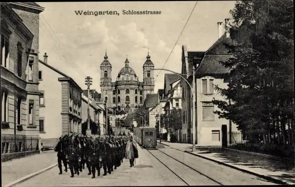 Ak Weingarten in Württemberg, Soldaten marschieren durch die Schlossstraße