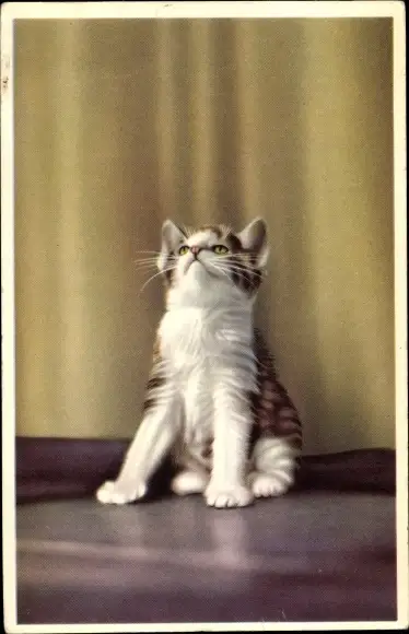 Ak Weiß braun getigerte Katze schaut in die Luft