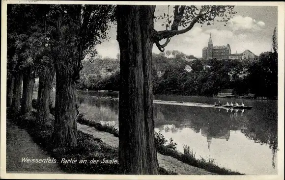 Ak Weißenfels an der Saale, Baumallee, Ruderboot