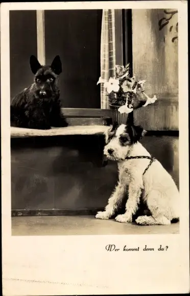 Ak Wer kommt denn da, zwei Terrier am Fenster, Hunde