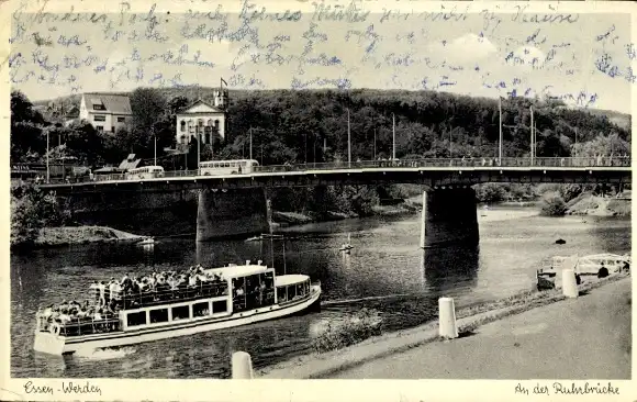 Ak Werden Essen im Ruhrgebiet, An der Ruhrbrücke, Ausflugsschiff