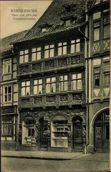 Ak Wernigerode im Harz, Haus von 1674 mit Holzschnitzereien