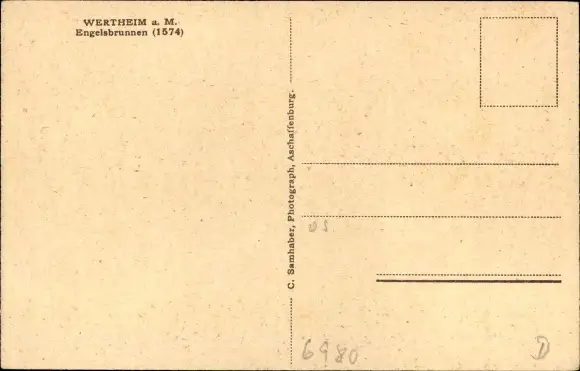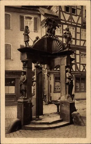 Ak Wertheim am Main, Engelsbrunnen, Statuen, Fachwerkhaus