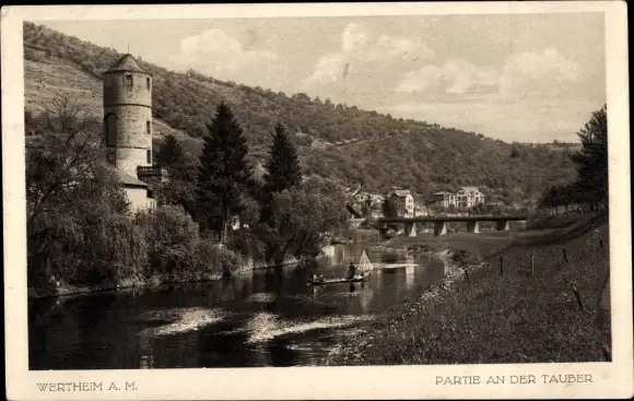 Ak Wertheim am Main, Tauber, Turm, Boot, Brücke