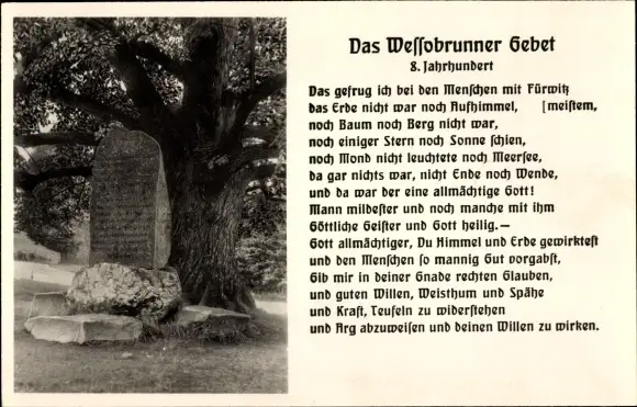 Ak Wessobrunn in Oberbayern, Wessobrunner Gebet aus dem 8. Jhdt., Gedenkstein