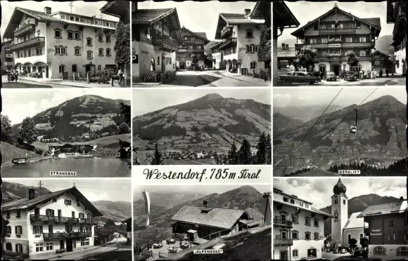 Ak Westendorf in Tirol, Strandbad, Alpenrose, Seilbahn, Straßenpartie