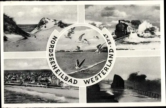 Ak Westerland auf Sylt, Inselbahn, Möwen, Dünen, Sturmflut