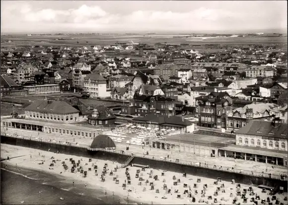 Ak Westerland auf Sylt, Kurpromenade, Luftaufnahme, Strand