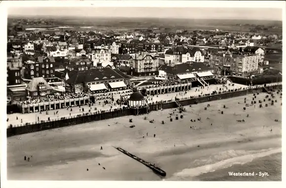 Ak Westerland auf Sylt, Nordseebad, Fliegeraufnahme von Strand und Umgebung