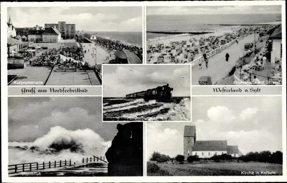 Ak Westerland auf Sylt, Promenade mit Strand, Kirche in Keitum, Sturmflut, Hindenburgdamm