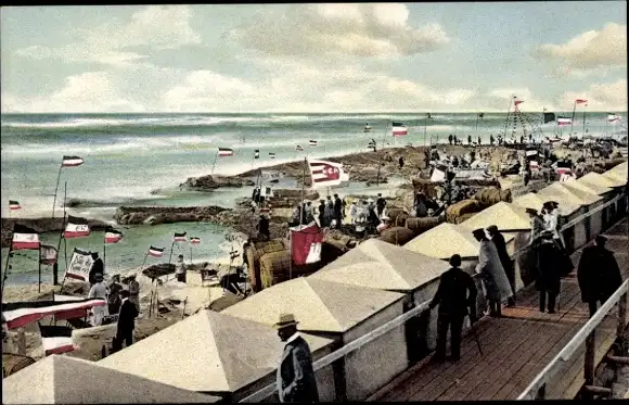 Ak Westerland auf Sylt, Strand, Personen, Strandkörbe, Flaggen