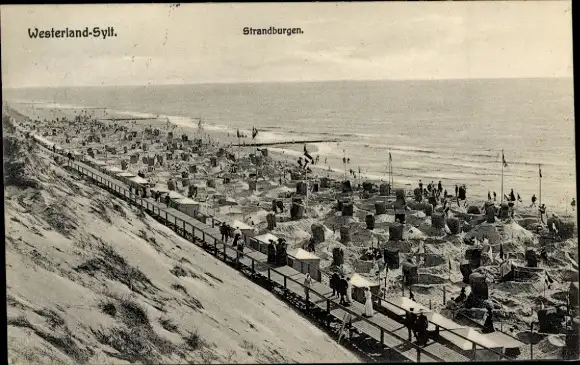 Ak Westerland auf Sylt, Strandburgen, Promenade, Strand, Brandung