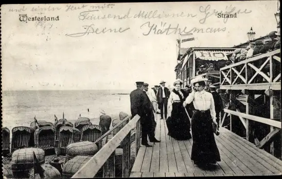 Ak Westerland auf Sylt, Strandkörbe, Steg, Passanten
