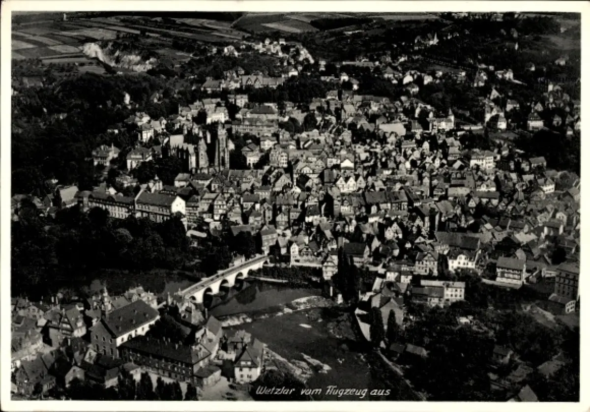 Ak Wetzlar an der Lahn, Luftaufnahme von Stadtansicht, Flussbrücke, Architektur