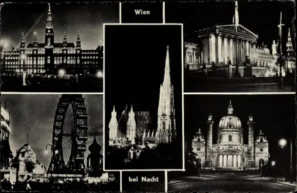 Ak Wien 1 Innere Stadt, Altstadt bei Nacht, Riesenrad, Domkirche, Rathaus, Parlament