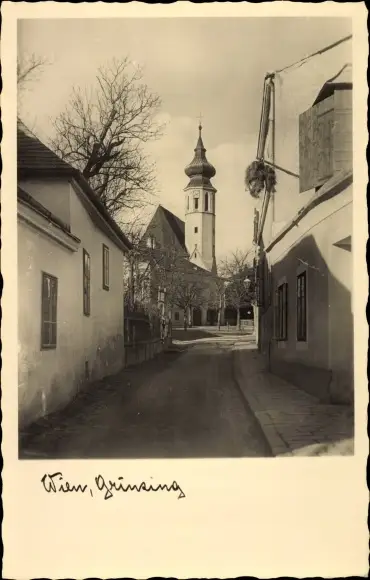 Ak Wien 19. Döbling, Grinzing, Straßenpartie, Kirchturm