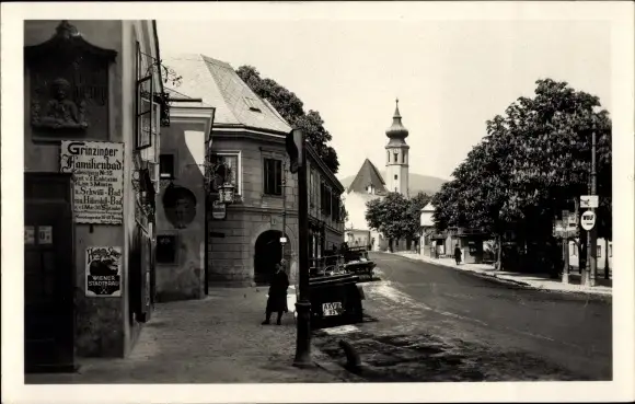 Ak Wien 19. Döbling Österreich, Grinzing, Grinzinger Familienbad, Straßenpartie, Kirche, Autos