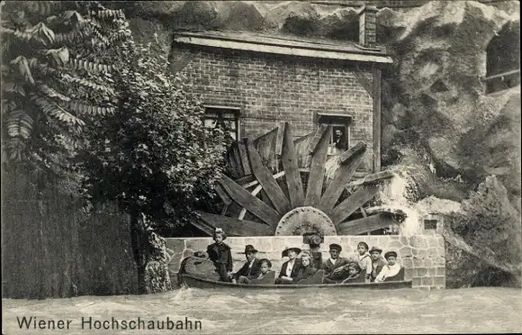 Ak Wien 2 Leopoldstadt, Prater, Hochschaubahn, Wassermühle, Fahrgäste im Boot